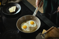 - Яйца на очи или омлет. Яйцата не са идеалният кандидат за тиган от стомана без покритие, но може да се приготвят. Загрейте добре тигана, сложете повече мазнина, намалете до по-умерен огън и незабавно сервирайте.