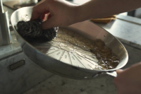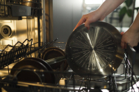 - Упорити остатъци почиствайте със стоманена четка или тел. Имайте предвид, че може да останат драскотини по повърхността на тигана, които са козметични и не се отразяват на готвенето. Алтернатива: накиснете в топла сапунена вода за 15–20 минути, после измийте на ръка.