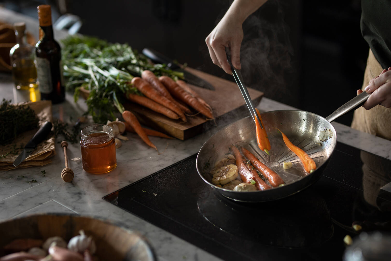 - Зеленчуци (моркови, аспержи, тиквички, гъби). Зеленчуците се приготвят на висока температура с малко мазнина и се посоляват накрая. Не ги задушавайте и оставете достатъчно пространство за контакт с дъното.